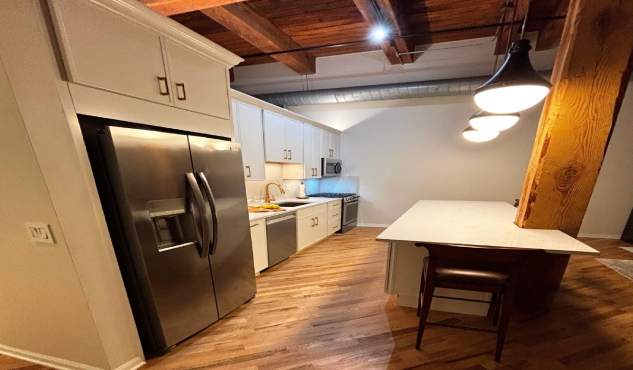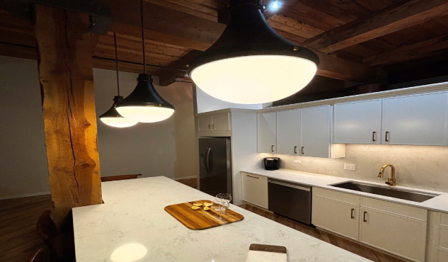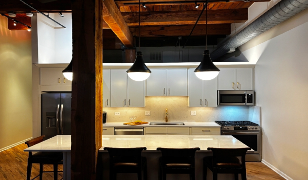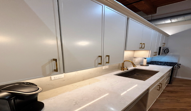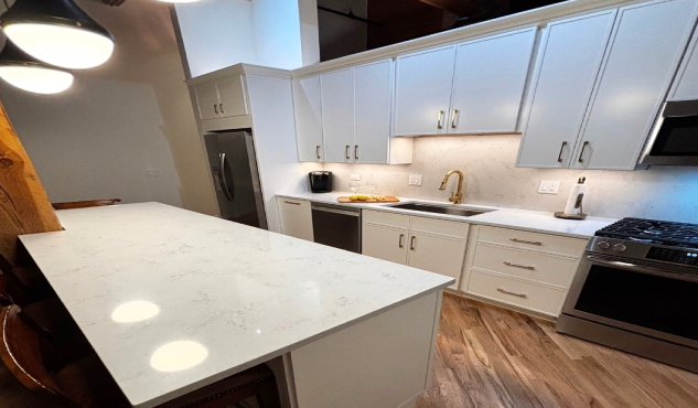 An amazing kitchen design that emphasize the efficiency ,workability and cleanliness. There is no wasted spaces and no unnecessary display of items or clutter. All the appliances are build-in and the work areas are easy to maintain and clean. This affordable kitchen cabinetry made by Fabuwood Cabinetry with Frost finish on the perimeter and Nickle finish on the island creates the space that anyone can enjoy it with the family and friends